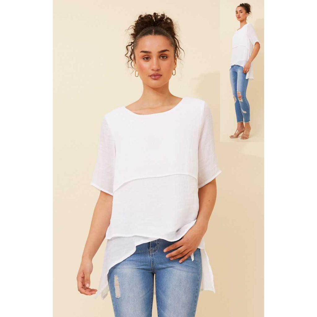 Elevate your everyday wardrobe with this refined short sleeve layered top in crisp white. The thoughtfully designed layers create visual depth and dimension, offering versatile styling options for both casual and polished occasions. Crafted for comfort and sophistication, this piece transitions seamlessly from day to evening, making it an essential addition to any discerning wardrobe. Perfect for layering or wearing solo, it pairs effortlessly with tailored trousers, denim, or skirts for an understated yet impactful look.