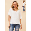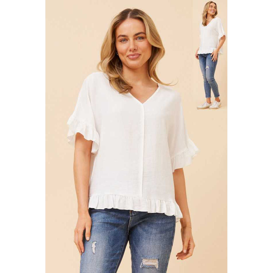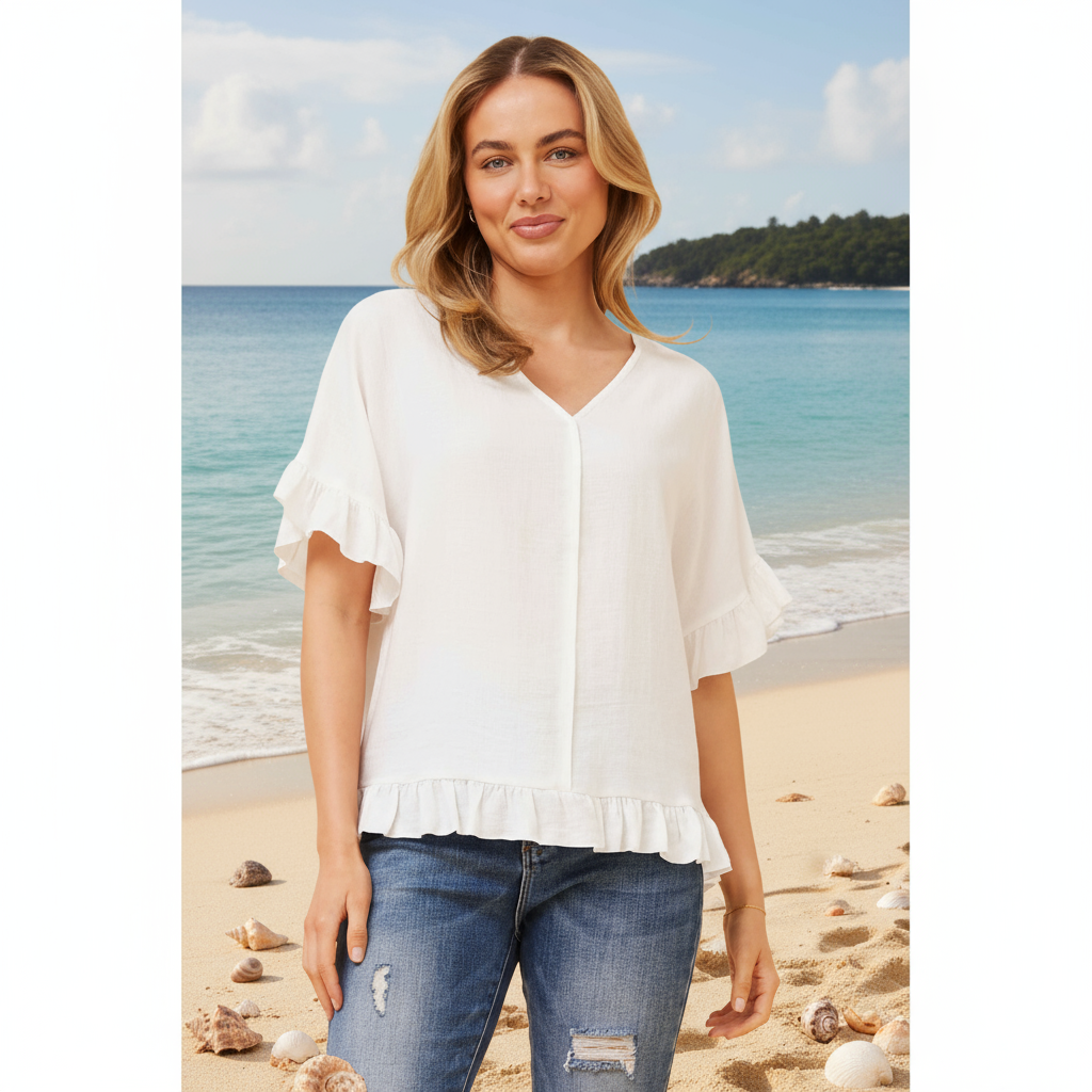 Elevate your everyday wardrobe with this refined V-neck top, crafted from a luxurious viscose nylon blend. The delicate frill detailing at the neckline adds an understated elegance, creating visual interest without compromising sophistication. The fluid fabric drapes beautifully, offering both comfort and a polished silhouette perfect for transitioning from office to evening occasions. A timeless piece that pairs effortlessly with tailored trousers or flowing skirts.