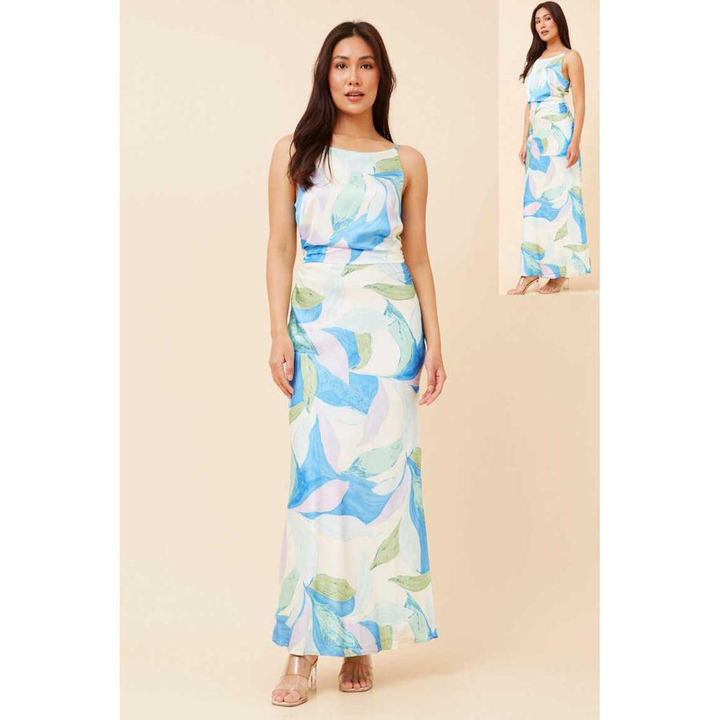This blue satin printed sleeveless maxi dress offers a graceful silhouette with its flowing fabric and elegant design. Perfect for warm days or special occasions, it combines comfort with style, allowing you to move freely while looking effortlessly chic. The vibrant print adds a touch of personality, making it a versatile addition to your wardrobe.