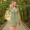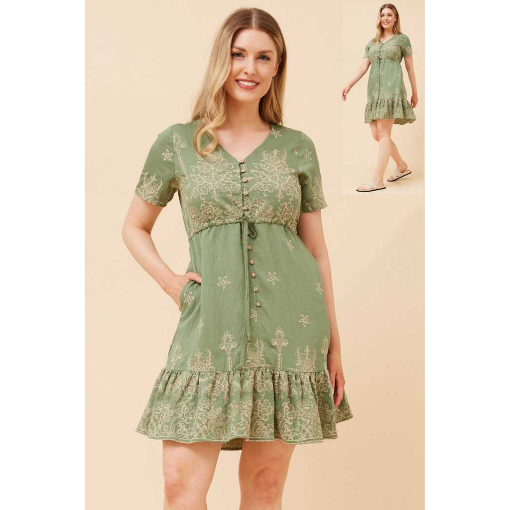 Elevate your everyday wardrobe with this refined short dress in soft sage. Crafted from a luxurious viscose nylon blend, it drapes beautifully while maintaining its shape. The thoughtfully placed pockets add practical elegance, while delicate ruffled detailing at the hem creates subtle movement and visual interest. Perfect for transitioning from day to evening, this versatile piece pairs effortlessly with sneakers or heels for an understated, polished look.