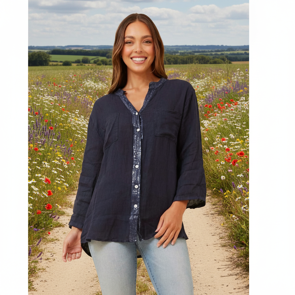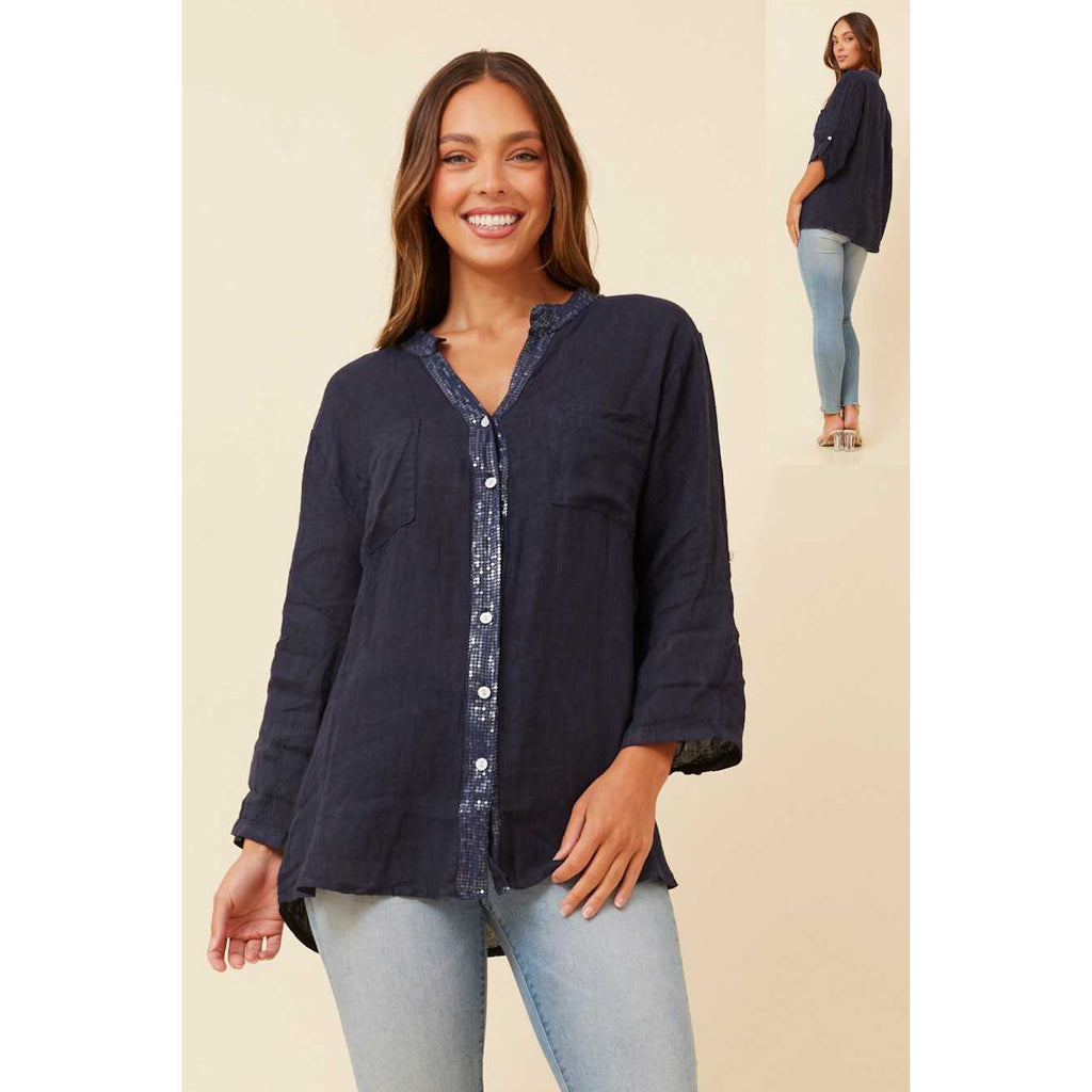 Be comfortable and stylish with the shirt. Made from breathable linen and featuring sequin detailing, this shirt offers a perfect blend of casual comfort and dressy detailling. Versatile to style, pair with jeans or shorts and complete your look with sneakers or diamante sandals.