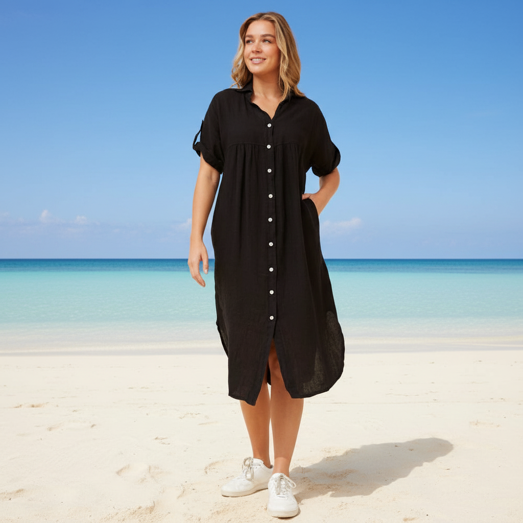 The dress is crafted from breathable linen fabric. This dress is easy to style with sneakers, heels or sandals for an everyday stylish look!