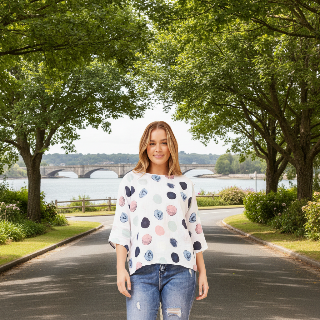 Our Made in Italy minimalist linen meets sweet blot print and relaxed 3/4th sleeves. With a light-weight airy fabric and relaxed fit, this top is a perfect summer staple! Match this with your favourite jeans and sandals to complete an effortless summer look!