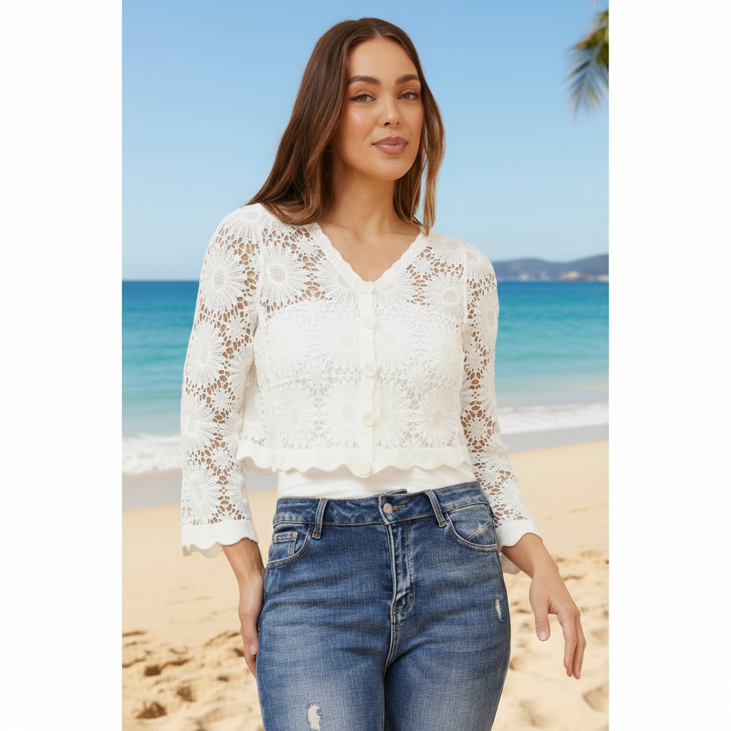 Elevate your ensemble with this Cropped Lace Cardigan in pristine white. Crafted from delicate lace, it offers a refined layering option that enhances any outfit with subtle elegance. The cropped silhouette adds a modern twist, perfect for accentuating your waistline while maintaining a sophisticated charm suitable for both day and evening wear.