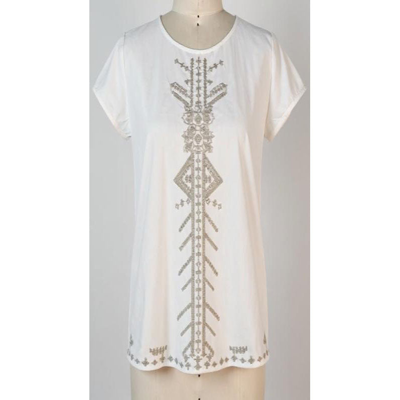 This black and white top features comfortable cap sleeves and a classic round neckline, offering a flattering fit for everyday wear. The intricate embroidered detail on the front adds a touch of elegance, making it easy to dress up or down while providing a stylish look that supports your confidence throughout the day.