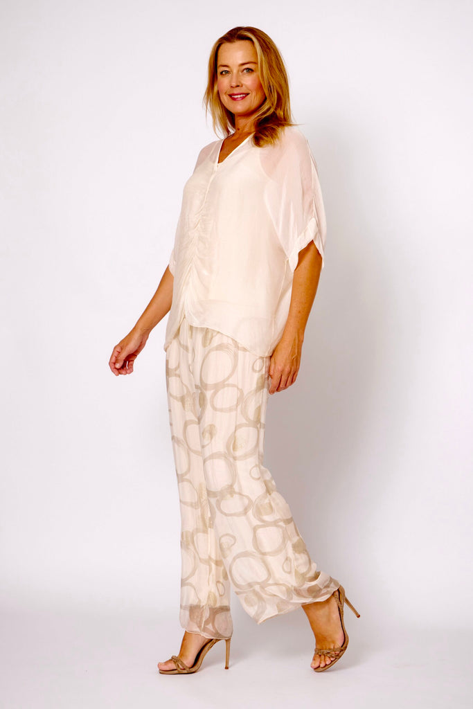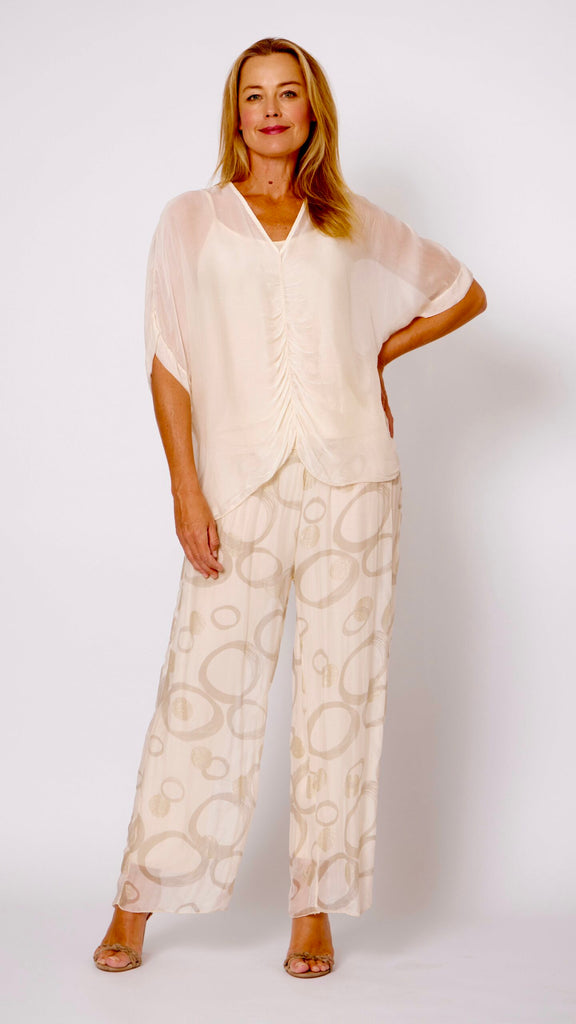 Elevate your wardrobe with the Ruched Middle Top with Cami in Ivory, crafted from a luxurious blend of 70% viscose and 30% silk. This sophisticated piece offers a soft, breathable feel while draping elegantly to enhance your silhouette. The ruched detailing adds subtle texture, making it perfect for refined daytime looks or chic evening ensembles.