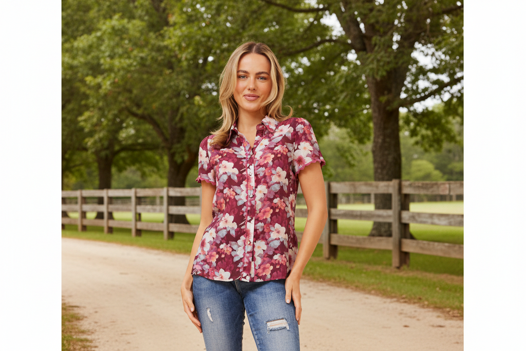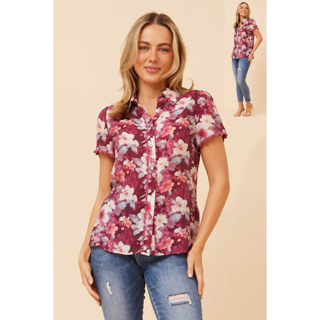 Bloom into style with this charming floral printed shirt in rich plum tones. Perfect for adding a pop of colour to your everyday wardrobe, this piece effortlessly transitions from casual brunch to weekend adventures. The vibrant floral design brings a fresh, garden-inspired vibe that's both timeless and on-trend. Lightweight and comfortable, it's your go-to shirt for those moments when you want to feel put-together without trying too hard. Pair it with your favourite denim or dress it up for something special—this versatile beauty does it all.