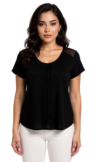 Crafted from a soft blend of 95% cotton and 5% spandex, this round neck tee from Cafe Latte offers a gentle stretch that moves with you throughout the day. The delicate lace and mesh trims add a touch of elegance, enhancing its style while maintaining comfort.
