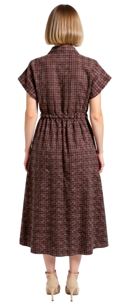 Elevate your everyday wardrobe with this refined café latte dress, featuring a sophisticated self-check textured fabric that adds subtle visual interest. The adjustable drawstring waist creates a flattering silhouette, while the classic collar and short sleeves deliver timeless elegance. Practical front pockets and finished sleeve cuffs complete this versatile piece, perfect for transitioning seamlessly from day to evening occasions.