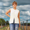 The Vianne vest stands out with its design and chic gold hardware. Perfect on its own, it brings a touch of sophistication to any outfit. Pair it with tailored trousers or a sleek skirt for a polished, formal look.