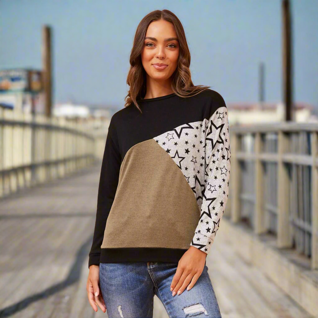 Embrace cozy style with this Long Sleeve Star Print Top in warm brown. Its soft fabric and relaxed fit provide all-day comfort, while the charming star pattern adds a playful touch to your wardrobe. Perfect for layering or wearing on its own, this top supports your casual looks with effortless charm.