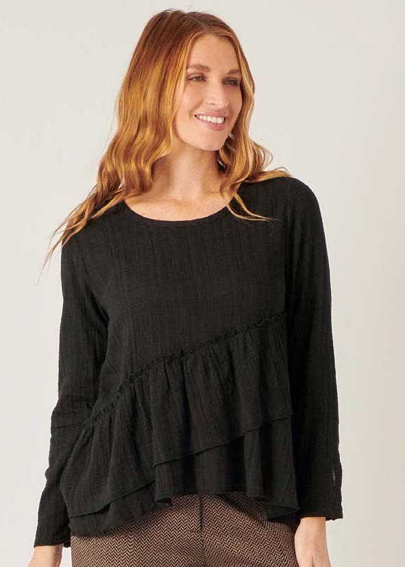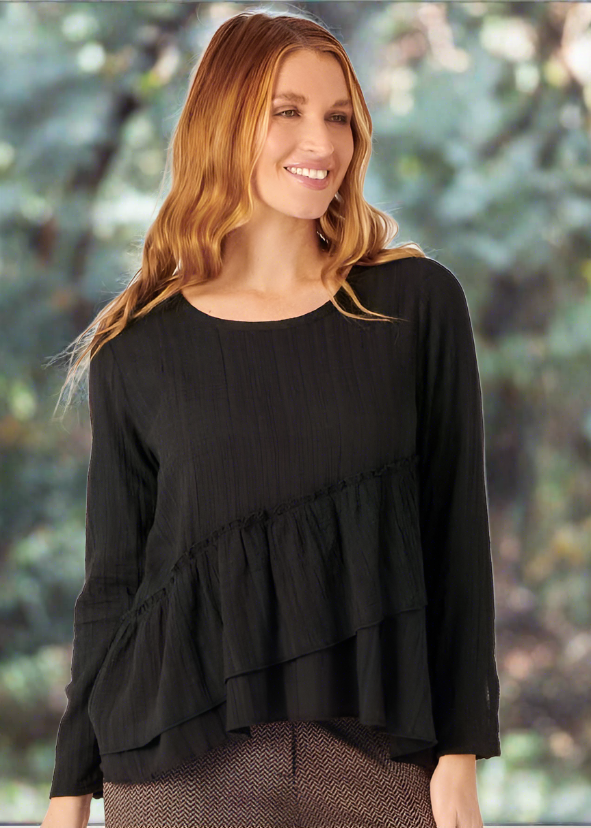 Libérez la fashionista qui sommeille en vous avec le haut asymétrique à volants en noir élégant ! Ce haut inspiré du jean présente un design superposé élégant, parfait pour être associé à votre jean préféré ou à des bottes hautes. Sortez avec style et faites sensation où que vous alliez.