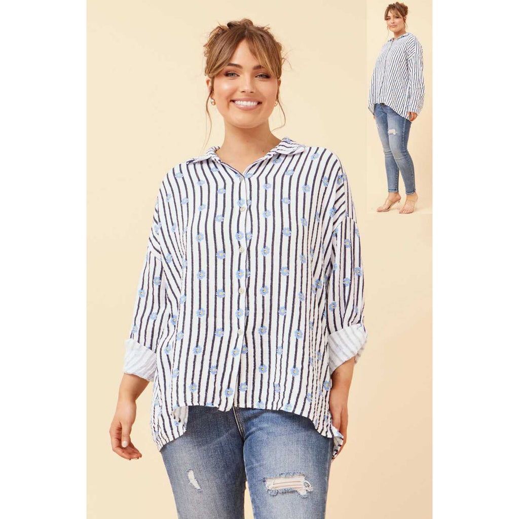 Long Sleeve Striped Shirt With Flower Print - Blue
