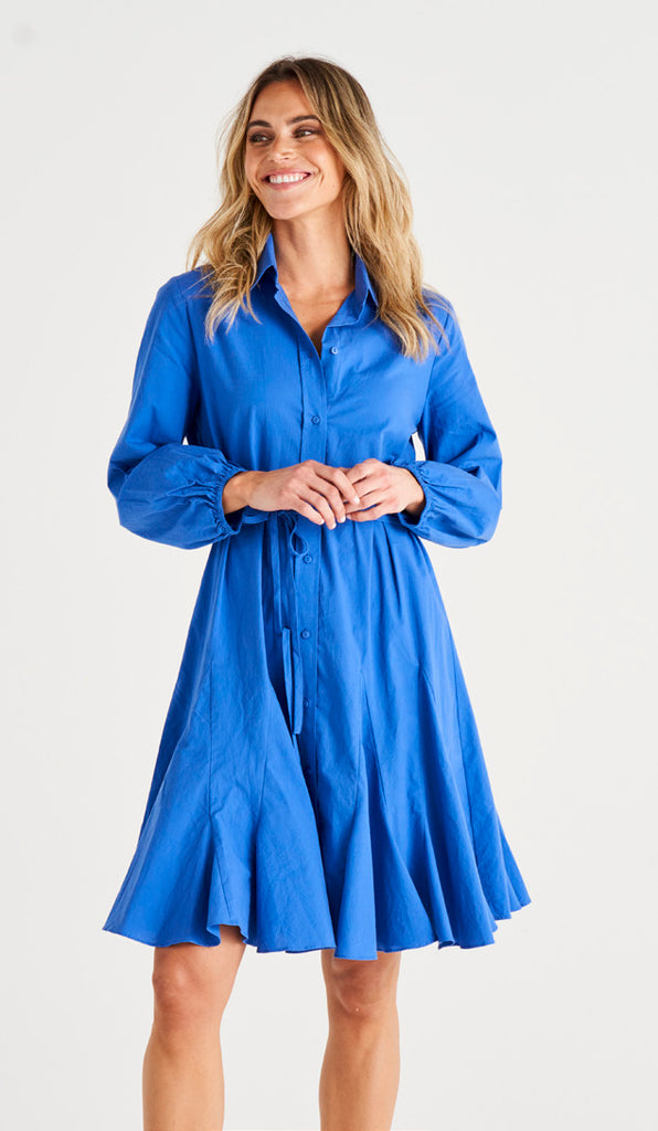 Whether you're heading to brunch or out for a casual evening, the Jada Dress effortlessly blends comfort and style. With its easygoing fit, shirt collar, and button-up design, this dress is the epitome of laid-back sophistication. Long sleeves with cuffs add a touch of flair, while the mini flare hem completes the look with Elevate your wardrobe with this versatile piece perfect for those who crave fashion with a relaxed twist. Unwind and embrace the mini-flare fun of the Jada Dress!